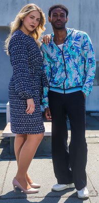 bis hin zu raffinierten Key-Pieces, die Unisex gedacht sind. Die Farbpalette bewegt sich zwischen klassischem Schwarz und Denim-Tönen bis hin zu expressiven Mustern in Blau-Grün, die einen frischen Akzent setzen.