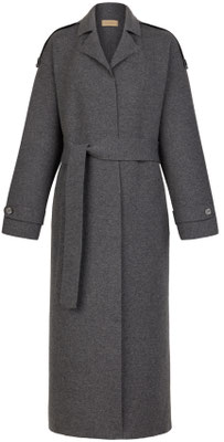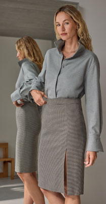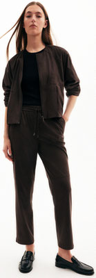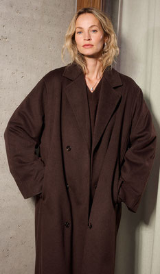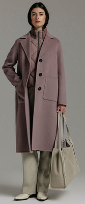 Kombination hochwertiger Materialien wie Flanell, Walkwolle und strukturiertem Satin. Die Farbpalette konzentriert sich neben Schokoladebraun auf Taupe und Mandel, ergänzt durch ein feminines Beeren-Mauve.