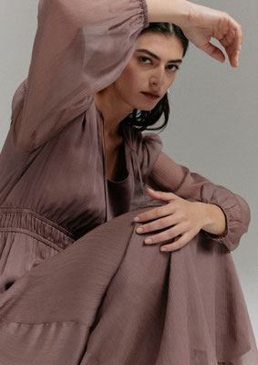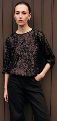 Romantische Blusen mit Rüschen und fließende Chiffonkleider bilden einen spannenden Kontrast zu grobem Strick und vereinen so Weichheit mit Struktur. Funkelnde Details setzen feminine Akzente, ohne den modernen, geerdeten Look zu verlieren.