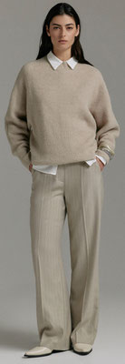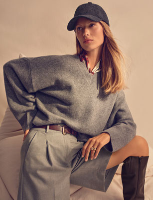 Strukturierter Strick, fließende Blusen aus Cashmere-Seiden-Mix, Jacken aus Cashmere-Velours und entspannt geschnittene Hosen in soften Wollmischungen schaffen eine Garderobe, die Stil und Komfort mühelos verbindet.